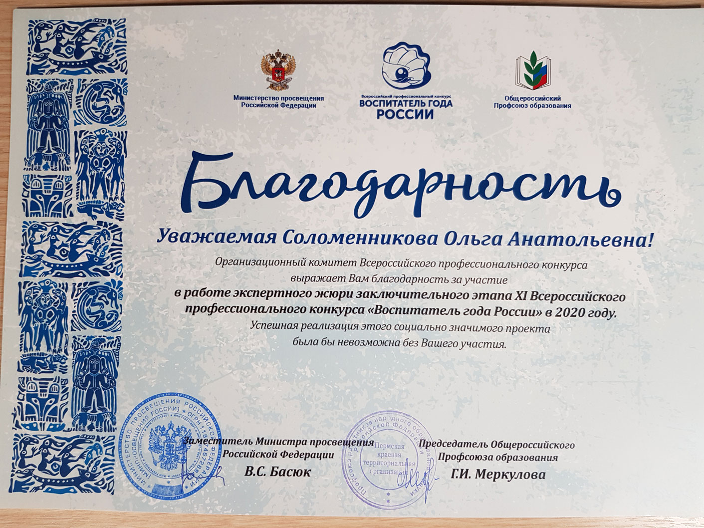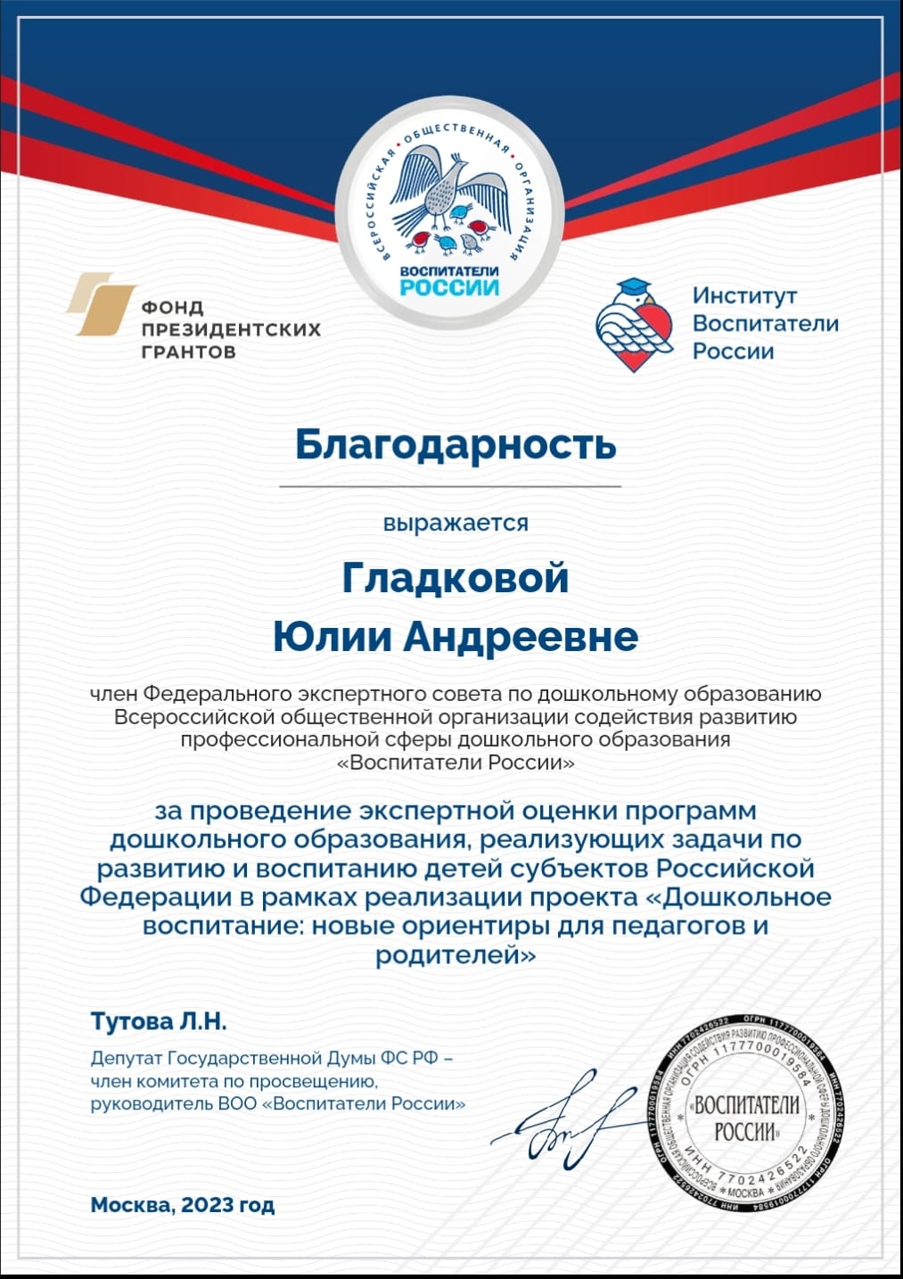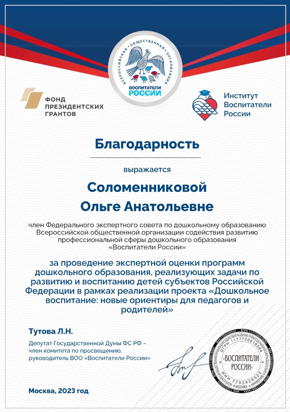 - Член президиума Федерального экспертного совета Всероссийской общественной организации содействия развитию профессиональной сферы дошкольного образования “Воспитатели России”