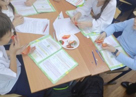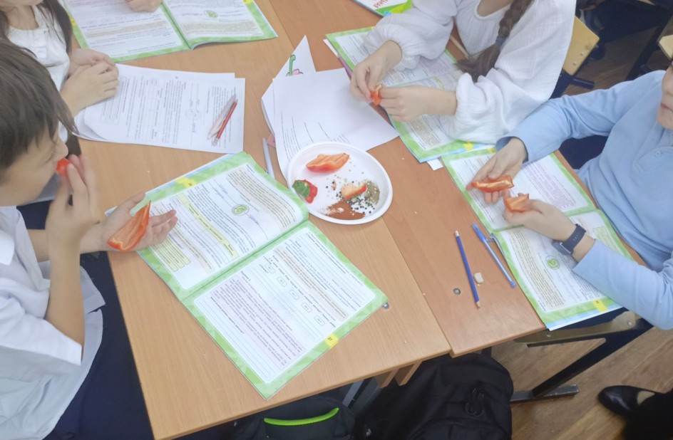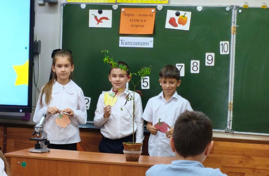На внеурочном занятии ребята 4 «Э» класса МБОУ СОШ №1 с УИОП г. Чехов познакомились с видами перца, искали ответ на проблемный вопрос, перец – это овощ или специя? Ученики рассмотрели внешнее строение растения, а также разрезанный плод. Узнали новое вещество – капсаицин, именно он влияет на остроту и жгучесть перца. Ребята в микроскоп рассматривали семя растения перца, таким образом узнали его строение. Узнали, как много полезных веществ содержит перец. Занятие прошло познавательно и увлекательно, а закончилось ароматной дегустацией.