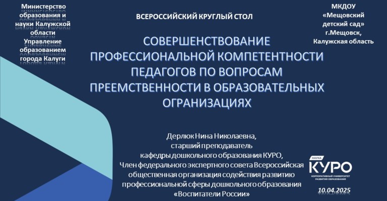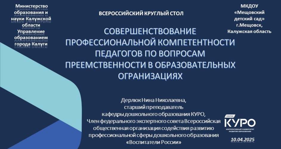 16 апреля 2025 года Нина Дерлюк, старший преподаватель кафедры дошкольного образования, приняла участие в работе круглого стола в Мещовском детском саду «Солнышко» Калужской области