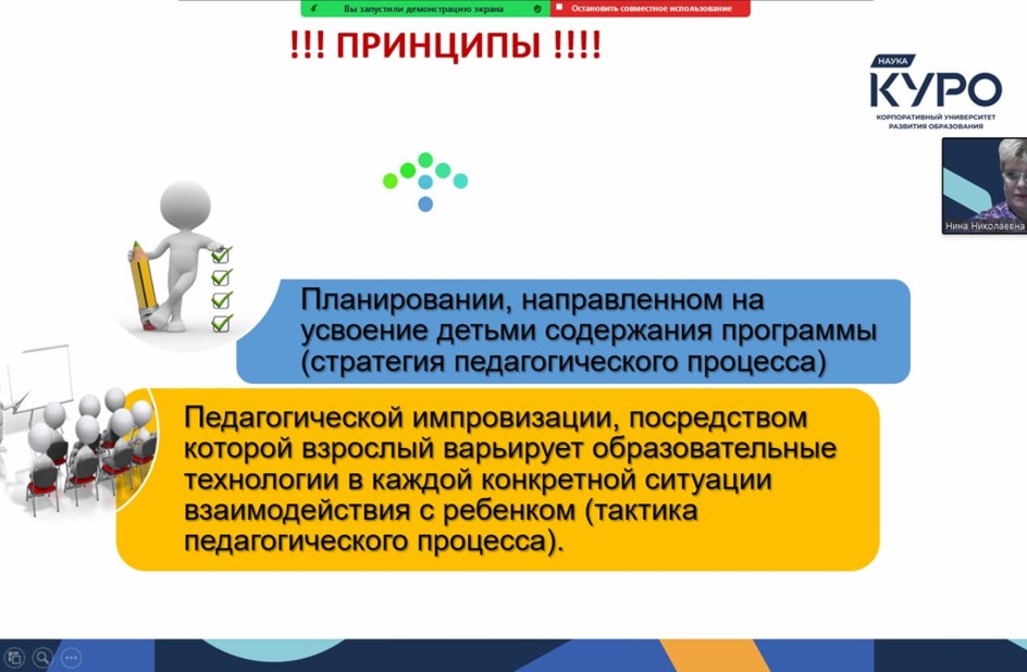 В выступлении старшего воспитателя Осокиной С.С. были выделены принципы инновационной деятельности: планирование, направленное на усвоение детьми содержания программы (стратегия педагогического процесса) и педагогическая импровизация, посредством которой взрослый варьирует образовательные технологии в каждой конкретной ситуации взаимодействия с ребенком.