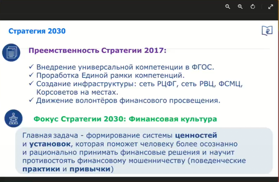 Екатерина Конина, главный эксперт отдела финансовой грамотности управления по связям с общественностью и финансовой грамотности Главного управления Банка России по Центральному федеральному округу, рассказала о специализированном инструментарии финансового просвещения от Банка России, в том числе об игровых методиках, которые помогают доступно доносить сложные финансовые концепции до аудитории разных возрастов.